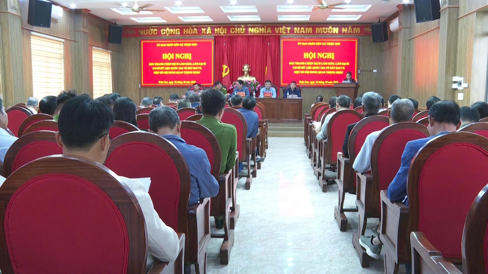 Sáng ngày 26/10, Ủy ban nhân dân xã Triệu Sơn tổ chức hội nghị triển khai và đẩy nhanh chiến dịch làm giàu, làm sạch Cơ sở dữ liệu Quốc gia về đất đai. Dự và chủ trì hội nghị có đồng chí Vũ Văn Ba – Phó Bí thư Đảng ủy, Chủ tịch UBND xã; cùng các đồng chí Phó Chủ tịch UBND xã, đại diện Công an xã, Chi nhánh Văn phòng Đăng ký đất đai Triệu Sơn, các ban ngành, đoàn thể và 14 tổ công tác được phân công thực hiện tại 47 thôn trên địa bàn.
